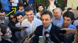O presidenciável tucano Aécio Neves esteve neste domingo em Curitiba para prestigiar a convenção do PSDB que confirmou a candidatura à reeleição do governador Beto Richa. Na hora da entrevista, olha só quem apareceu ao fundo da foto: o mourãoense Mykymias Queiroz, que foi candidato a vereador em Campo Mourão. Tá pensando o quê!...