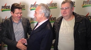 O vice-presidente Michel Temer participou de evento do PMDB em Curitiba e o prefeito de Corumbataí do Sul, Carlos Caxão, aproveitou para cumprimentar o homem. Caxão é do PDT, mas o vice-prefeito Xandão Donato (à dir.) é peemedebista. Ufa, salvo pelo vice...
