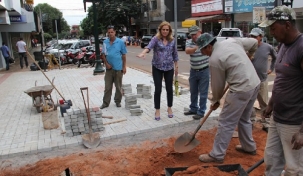 A prefeita Regina Dubay foi acompanhar os trabalhos de revitalização do calçadão. A obra tem um investimento de R$ 490 mil e consiste na troca de todo o piso de petit-pavê por paver, reforma de bancos, floreiras, plantio de novas árvores e adequação para acessibilidade. A execução é da Codusa e o dinheiro veio da venda das contas-salários dos servidores para a Caixa Econômica.