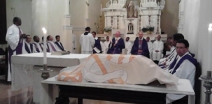 Olha aí, em primeiro plano, a urna com os restos mortais do bispo d. Eliseu Simões Mendes, que chegam nesta quinta-feira a Campo Mourão. A foto foi feita durante missa na Catedral de Feira de Santana/BA, na quarta-feira. A missa por lá foi celebrada pelo bispo local d. Itamar Navildo Vian. Em Campo Mourão haverá sete missas com os restos mortais, sendo que a primeira, às 19h desta quinta-feira, será celebrada pelo arcebispo de Maringá, d. Anuar Battisti.