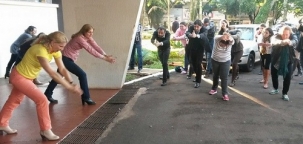 Os servidores municipais lotados no Paço Municipal tiveram que esticar o esqueleto nesta quarta-feira. Tudo para contar pontos no Dia do Desafio, quando Campo Mourão enfrentou Chalchuapa, de El Salvador. Nem a prefeita Regina Dubay escapou. A vereadora Nelita Piacentini, que é professora de educação física, esteve por lá e ajudou a movimentar o pessoal. Ah, pensa que é só cobrar imposto, é?...