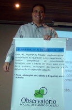 O vice-prefeito Rodrigo Salvadori participou nesta quarta-feira da reunião do Observatório Social. E não foi embora de mão abanando, não. Ganhou um banner de presente do novo presidente da entidade, Nelson Botega. O banner reproduz um trecho da lei que prevê punição para fraudes em concorrências públicas. Botega sugeriu que o presente seja fixado sala onde são feitas as licitações da prefeitura. Hummmm...