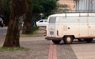 “Na av. Goioerê a calçada nova ficou bonita, dentro dos padrões de acessibilidade, mas existe um recuo para estacionamento e é comum acontecer isso: os carros ficam com a traseira sobre o passeio, em especial sobre a faixa destinada aos deficientes visuais”.