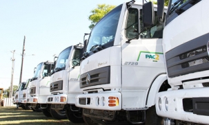 Depois das 44 retroescavadeiras e 104 motoniveladoras, começaram a chegar os caminhões que serão entregues pelo governo federal em Campo Mourão. Os 16 primeiros chegaram ao Parque de Exposições nesta sexta-feira. Outros 16 vêm na próxima semana. A entrega vai acontecer dia 3 ou 4 para municípios com até 50 mil habitantes. A expectativa é que a presidenta Dilma Rousseff participe do evento.