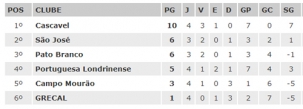 O time se Campo Mourão segue em 5º lugar, com três pontos.