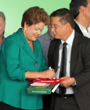 A presidenta Dilma Rousseff cumprimentou todos os prefeitos que vieram receber as máquinas e caminhões em Campo Mourão. Aí cada um aproveitou os segundinhos ao lado dela da melhor maneira que pode. O petista Claudinei Minchio (Peabiru), por exemplo, conseguiu um autógrafo da presidenta numa bandeira do PT. Hummmmmmm...