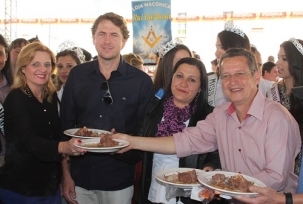 Na hora do clic oficial, o prefeito anfitrião Claudinei Minchio passou um prato para a prefeita vizinha Regina Dubay.