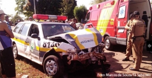 Uma viatura Parati da Polícia Militar de Campo Mourão ficou destruída num acidente nesta sexta-feira. Foi no jardim Tropical, durante perseguição policial. Os policiais seguiam um Kadett quando deram de frente com um Fiesta. Os dois PMs e o motorista do Fiesta tiveram ferimentos leves. O Kadett foi parado depois por outras viaturas. Sabe por que o motorista fugia? Não tinha carteira. E nós agora temos uma viatura a menos...