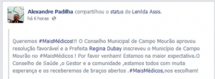 O ministro da Saúde, Alexandre Padilha, compartilhou uma postagem da presidente do Conselho de Saúde de Campo Mourão, Lenilda de Assis.