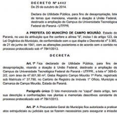Foi publicado o decreto da prefeitura que prevê a desapropriação de área a ser doada para ampliação do câmpus da UTFPR de Campo Mourão.