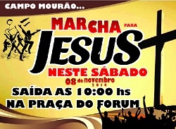 Você sabia que 8 de novembro é o Dia Municipal do Evangélico? Tem lei e tudo em Campo Mourão. Para comemorar, haverá Marcha para Jesus. Será a partir das 9h, com concentração na praça do Fórum. A chegada será na praça central, onde acontecerá culto de adoração a Deus, louvor e pregação da palavra.