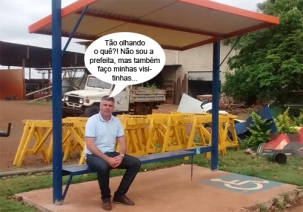 Quem disse que só a prefeita Regina Dubay faz suas visitinhas? O vereador Edilson Martins também faz. Nesta sexta-feira, foi ver como anda a construção dos pontos de ônibus. Foi informado que a instalação começa em 10 dias. Serão 100 pontos, num investimento de R$ 81 mil (R$ 63 mil em materiais e R$ 18 mil em mão de obra). Martins aproveitou e fez pose no "ponto-modelo" montado na Secretaria de Obras.