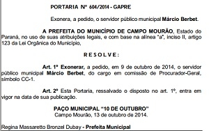 Durou somente quatro dias a exoneração do procuradora geral da prefeitura, Márcio Berbet.