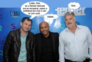 O clic é da semana passada, nos bastiores da Expomam. Com Renner doente, o cantor Rick teve que fazer show sozinho em Mamborê. Mas não faltou tietagem. O prefeito Nei Calori e o vice-prefeito Paulo Rotta não resistiram sem uma pose ao lado do sertanejo.