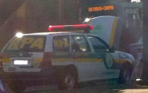 "No final da tarde desta quarta-feira, viatura da Polícia Militar apresenta defeito e para em frente ao terminal de ônibus urbano, no centro de Campo Mourão".