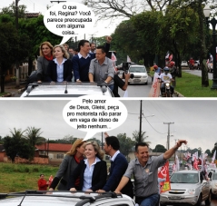 O clic é desta quinta-feira, quando a candidata a governadora Gleisi Hoffmann (PT) esteve em Peabiru, onde participou de carreata ao lado do prefeito Claudinei Minchio, que também é petista. A prefeita de Campo Mourão, Regina Dubay (PR), que é Gleisi desde criancinha, foi à cidade vizinha dar uma força à "companheira".