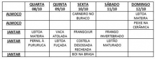 Já no almoço de domingo haverá leitoa mateira (Mamborê) e peixe na cerâmica (Fênix).