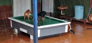 foi assim, os cães jogando sinuca enquanto esperam a a água baixar".