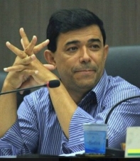 Sidnei Jardim (PPS), vereador de Campo Mourão, ao ser pego de surpresa, na rua, com propaganda do deputado estadual Douglas Fabrício (PPS), que mostra o candidato ao lado dos vereadores do partido.