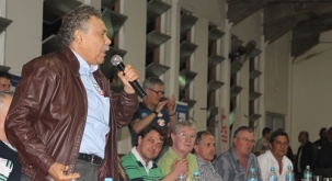 Antônio Sena (PMDB), ex-prefeito de Goioerê, ao iniciar o discuro durante o comicio do candidato a governador Roberto Requião (PMDB)), em Campo Mourão, nesta quinta-feira.