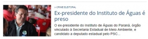 A "Gazeta do Povo" deste sábado traz matéria sobre o caso de Márcio Nunes. "Ex-presidente do Instituto das Águas é preso", destaca o título. Segundo o jornal, se comprovadas as acusações e for eleito, "o ex-presidente pode ter o mandato cassado por crime eleitoral". À Boca Santa, Nunes disse que nada liga ele aos fatos alegados pela denúncia. "Estou solto e desmentindo os boatos", afirmou ao Site.