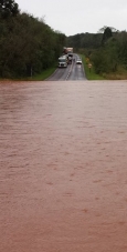 Acredite se quiser, mas essa é a rodovia Vassílio Boiko, entre Roncador e Nova Cantu, após a chuvarada do fim de semana. O tráfego de veículo ficou interditado por algumas horas, até que o nível da água baixasse. Nova Cantu também sofreu com a cheia do rio Tonete, no bairro Santa Terezinha, que inundou várias casas.