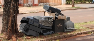 "Na av. José Custódio de Oliveira, centro de Campo Mourão, o canteiro central virou depósito de carcaças de aparelhos de televisão".