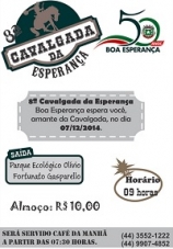 Boa Esperança - Acontece no próximo dia 7 a 8.a Cavalgada da Esperança. A saída será do Parque Ecológico, às 9h. Também irá ser servido o café da manhã, às 7h30. No almoço tem encerramento, com valor de R$ 10. Haverá sorteio de brindes aos participantes.
