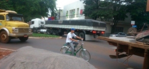 Av. Capitão Índio Bandeira, esquina com rua Harrison José Borges, no centro de Campo Mourão, na manhã desta sexta-feira. A carreta passa pelo local como se fosse a coisa mais normal do mundo. Foto: Edson Battilani