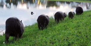 Capivaras andam em fila indiana no Parque do Lago, neste domingo, em Campo Mourão. Felipe Duarte