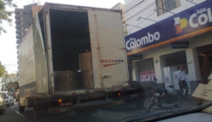 Não é só horário e peso que é desrespeitado na hora da carga e descarga de caminhões no centro de Campo Mourão. Esse aí estacionou em fila dupla para o serviço. André