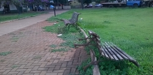 Banco da praça Alvorada, no Lar Paraná, está quebrado. Ao fundo, dá pra ver que a lixeira também não existe mais.