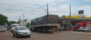 Carreta passa pela rua Santa Catarina e atravessa a av. Capitão Índio Bandeira, no centrão de Campo Mourão, nesta terça-feira. Edson Battilani