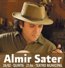 O cantor Almir Sater fará show em Campo Mourão dia 26 de fevereiro (21h). Será no Teatro Municipal, numa quinta-feira. Os ingressos já estão à venda. Valor? R$ 125 a inteira e R$ 65 a meia. Interessados podem comprar na Fiorella ou ligar para o Carlinhos (44) 9925-2268.