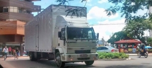 Foto feita nesta segunda-feira pouco antes do meio-dia. O caminhão passa pela av. Capitão Índio Bandeira, cruzando a rua Harrison José Borges, bem no centrão de Campo Mourão.