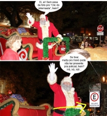 Ainda tem fotos da chegada oficial do Papai Noel a Campo Mourão pra gente mostrar. Ainda mais quando esses cliques rendem uns balõezinbos. Que fique claro: o trenó do "bom velhinho" tinha autorização para subir pela calçada rumo à praça e até passar pelo local reservado à Polícia Militar. Ô gente, o espírito natalino está acima disso...