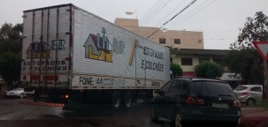 Nesta segunda-feira à tarde, poucas horas depois da Câmara rejeitar o projeto que aumentava o peso permitido para caminhões transitarem pelo centro de Campo Mourão, mais um flagra foi feito. O caminhão está passando pela rua Araruna.