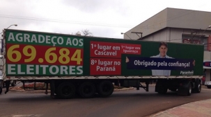 Quando a gente pensa que já viu de tudo em relação a invasão dos caminhões no centro da cidade, olha só esse flagra. A carretona de propaganda de um deputado reeleito passa pela av. Capitão Índio Bandeira, esquina com a rua São Paulo. Isso nesta segunda-feira pela manhã. Em tempo: Leonaldo Paranhos fez 142 votos em Campo Mourão. E a pergunta que não quer calar: será que ele pode ir entrando com carreata, assim no centro de Cascavel?...