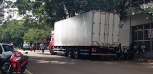 Rua Harrison José Borges, em frente ao Bradesco, nesta quinta-feira, às 11h20. O caminhão não poderia estar aí de jeito nenhum, mas não só estava, como ainda se achou no direito de estacionar em fila dupla. Márcio