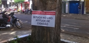 Quem fuma muitas vezes nem percebe, mas boa parte dos fumantes tem o péssimo hábito de jogar as bitucas de cigarro no primeiro lugar que vê pela frente. Isso inclui ruas e calçadas. Ou canteiros e base de árvores públicas. No Cafezinho, em frente ao HSBC, uma placa na árvore foi curta e grossa com quem tem este costume. Apoiada!...