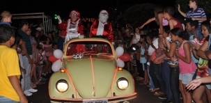 Que trenó, que nada! O Papai Noel chegou a Goioerê neste domingo num Fusca conversível. E veio acompanhado da Mamãe Noel. Uma multidão estava na praça da matriz esperando a chegada do "bom velhinho", quando apareceu uma carreata organizada pelo Clube do Fusca. Um Fusquinha todo iluminado trazia o Papai Noel.