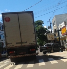 As três fotos, enviadas por internautas nesta quarta-feira, mostram caminhões no centro de Campo Mourão fora do horário de carga e descarga.