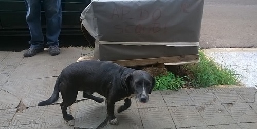 Esse aí, todo sem graça, é o Scooby. Ao fundo, a caixa é o "apartamento" dele. Fica na av. Manoel Mendes de Camargo, quase esquina com a rua Interventor Manoel Ribas. O simpático viralatas foi adotado pelo pessoal que trabalha nas redondezas. Ganhou a casinha e recebe comida todo dia. A cachorra Neguinha também foi beneficiada. E viva os melhores amigos do homem!...