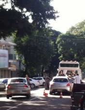 "Rua Mato Grosso, no centro de Campo Mourão, na tarde desta segunda-feira. Caminhão plataforma para no mei da rua e usa cones para interromper o trânsito. Tudo para que um carro pudesse ser "carregado". Pode isso, Arnaldo, fazer essa operação no meio de uma rua central, em horário comercial?"