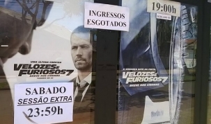 O filme "Velozes & Furiosos 7" segue em exibição, em duas sessões (19h e 21h30) no Cinemaxs. Pudera. Na primeira semana deu lotação completa em todas as sessões. E fila na porta do cinema uma hora antes para garantir os melhores lugares. Neste sábado haverá até sessão extra às 23h59.