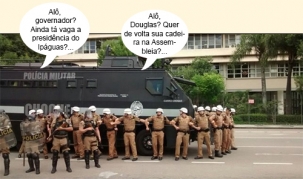 O clic é da semana passada, quando a tentativa de votar o tratoraço incluiu até o transporte dos deputados da base governista em veículo de choque da Polícia Militar. Tinha mais de 30 parlamentares nesse camburão, entre eles o mourãoense Márcio Nunes e a guarapuavana Cristina Silvestri, que assumiu a cadeira de Douglas Fabrício. Que situação...
