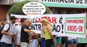 O clic é da manifestação dos professores e servidores da educação estadual, terça-feira, quando eles se concentraram em frente à Câmara de Vereadores. O professor Joseval Peliser mostra alguma coisa no tablet para a vereadora Nelita Piacentini. Ah, deve ser alguma nota da Boca Santa, só pode...
