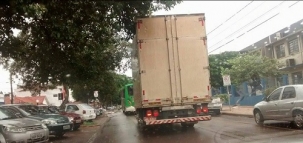 Caminhão passa pela av. Capitão Índio Bandeira, em frente ao colégio Santa Cruz, no centro de Campo Mourão. O flagra é desta quinta-feira à tarde.