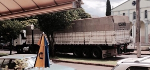 Carreta cruza a av. Manoel Mendes de Camargo, no centro de Campo Mourão. Na hora da foto, estava em frente à igreja ucraniana. Fernando Lorenzzo