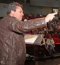 Valdir Rossoni (PSDB), chefe da Casa Civil, num momento rasgação de seda, ao fazer referência aos mourãoenses Márcio Nunes (PSD) e Douglas Fabrício (PPS), durante anúncio de recursos para a saúde; no Teatro Municipal, neste sábado.